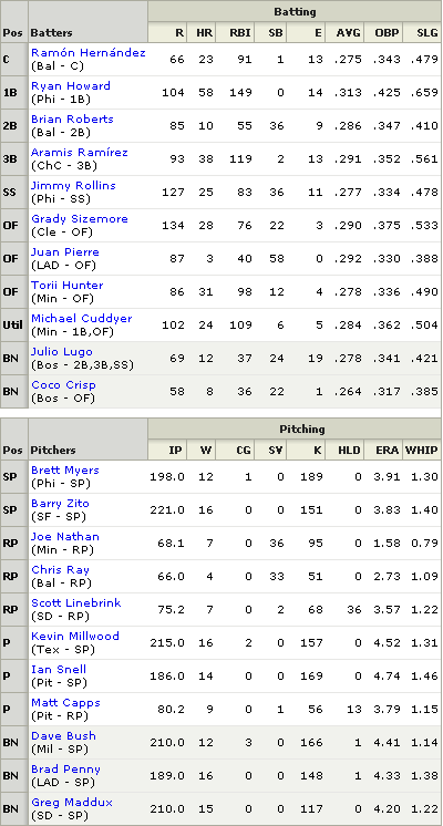 In preparation for this week’s event, I took part in four different mock drafts over at Mock Draft Central. I can see you turning green with envy already. Once a night for the four days prior to the real deal, I tested drafting strategies and studied the competition – all the while compiling the most thorough and colorful draft day cheat-sheet in glorious Excel spreadsheetitude. Ok ok, I see you salivating. Please allow me to cut to the chase and introduce to you my 2007 fantasy lineup: