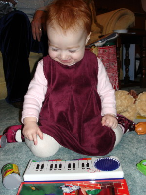 A full month hasn’t passed since all the gift giving began so I figure I’m still within the statute of limitations to post adorable photos and video of the proceedings. Another big thank you to everyone for the wonderful musical instruments, building blocks, puzzles, implements of destruction, clothing, cash, supermarket checkout counters, stuffed animals of every genus and species, and all those books that come with that integrated musical side panel playing all our favorite nursery rhymes at the simple touch of a button.